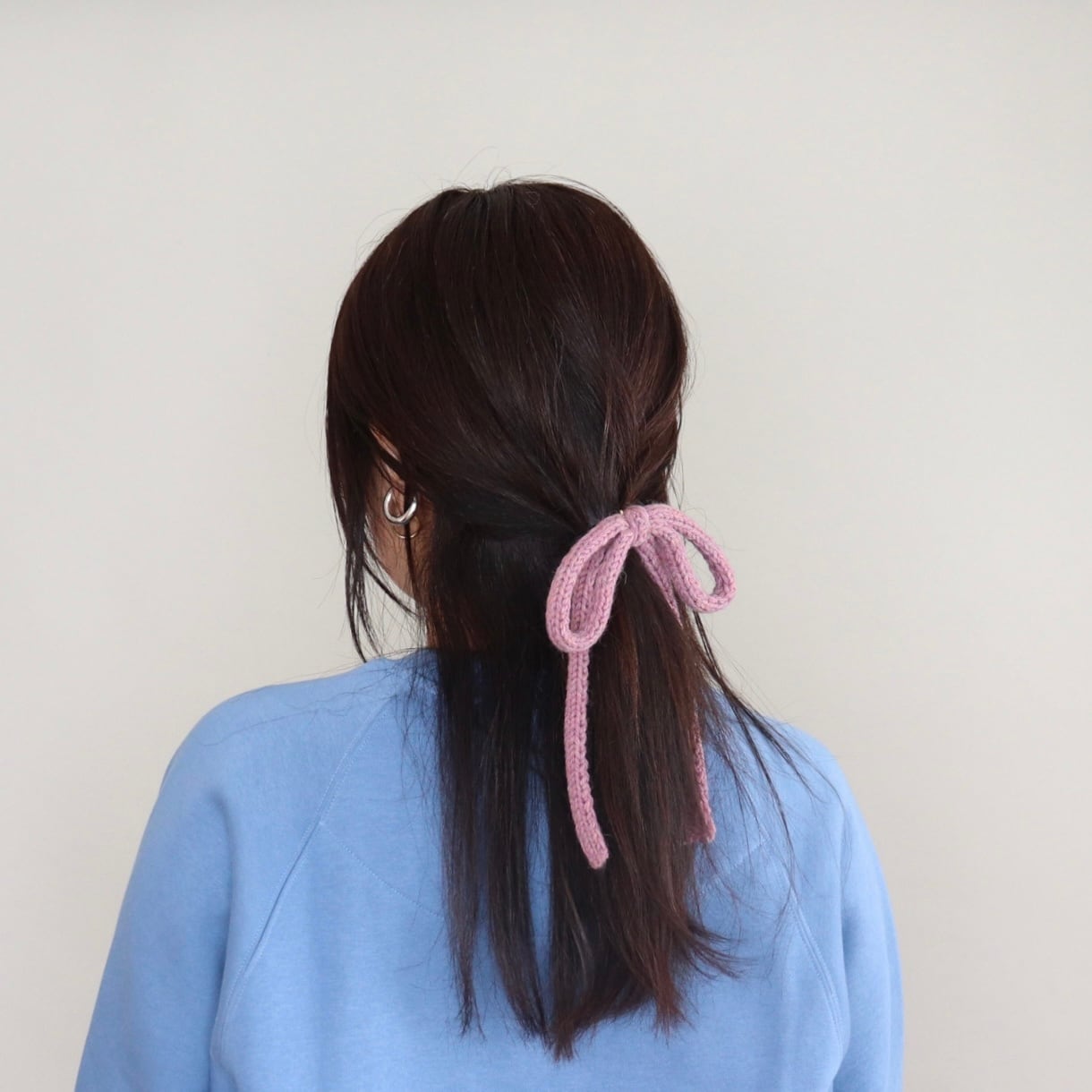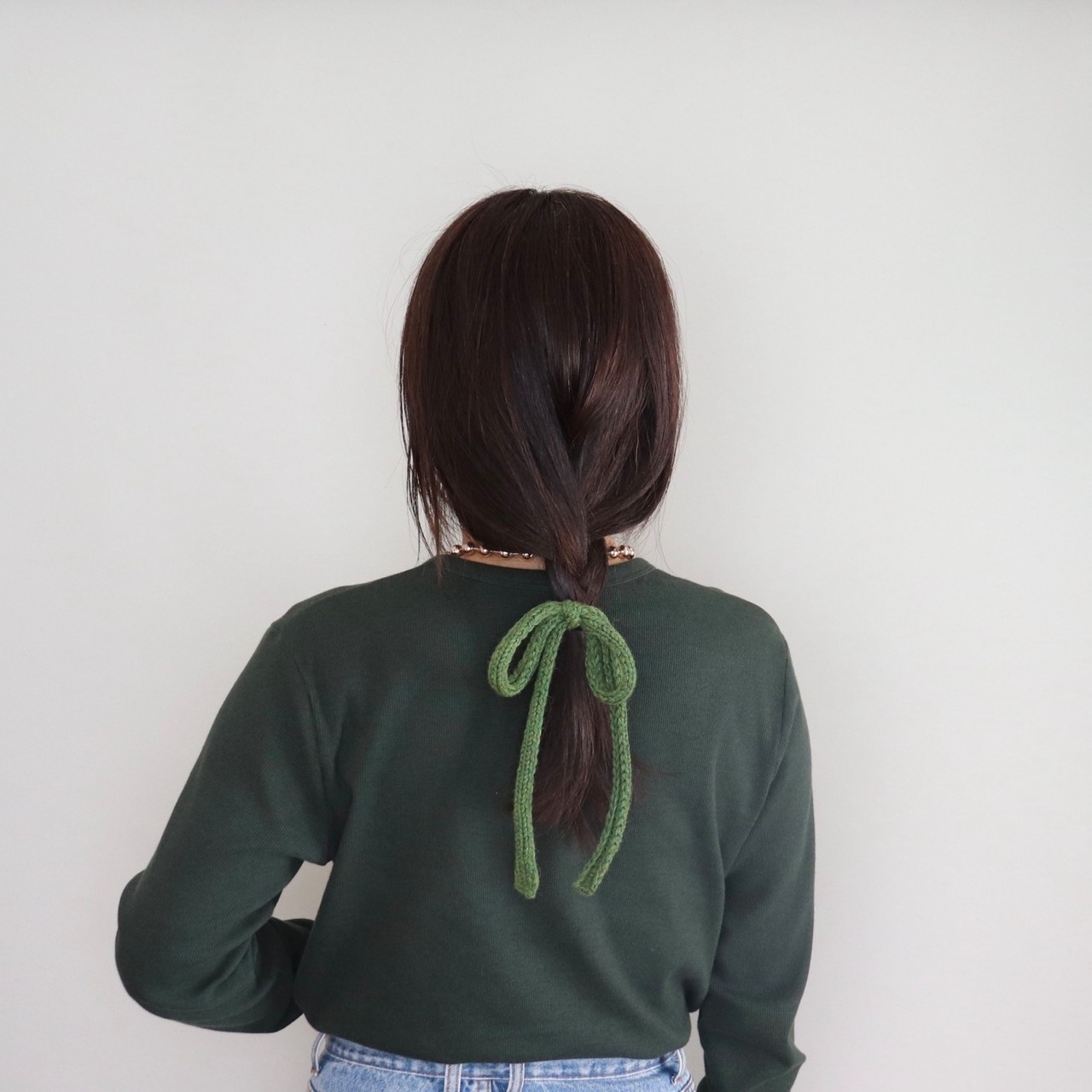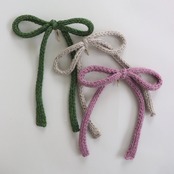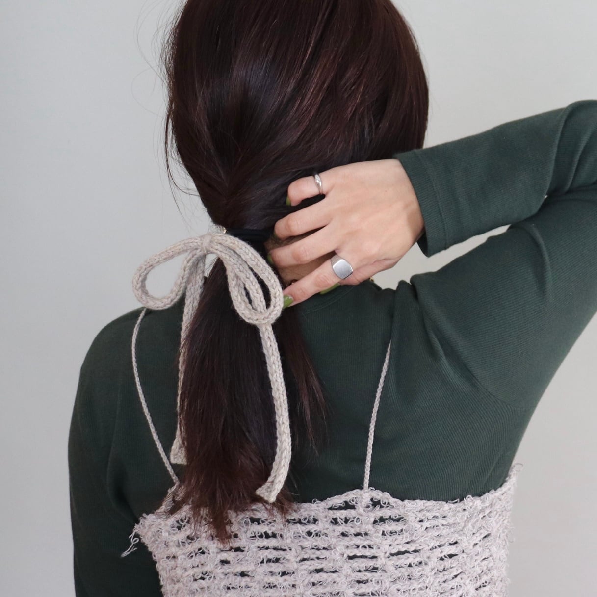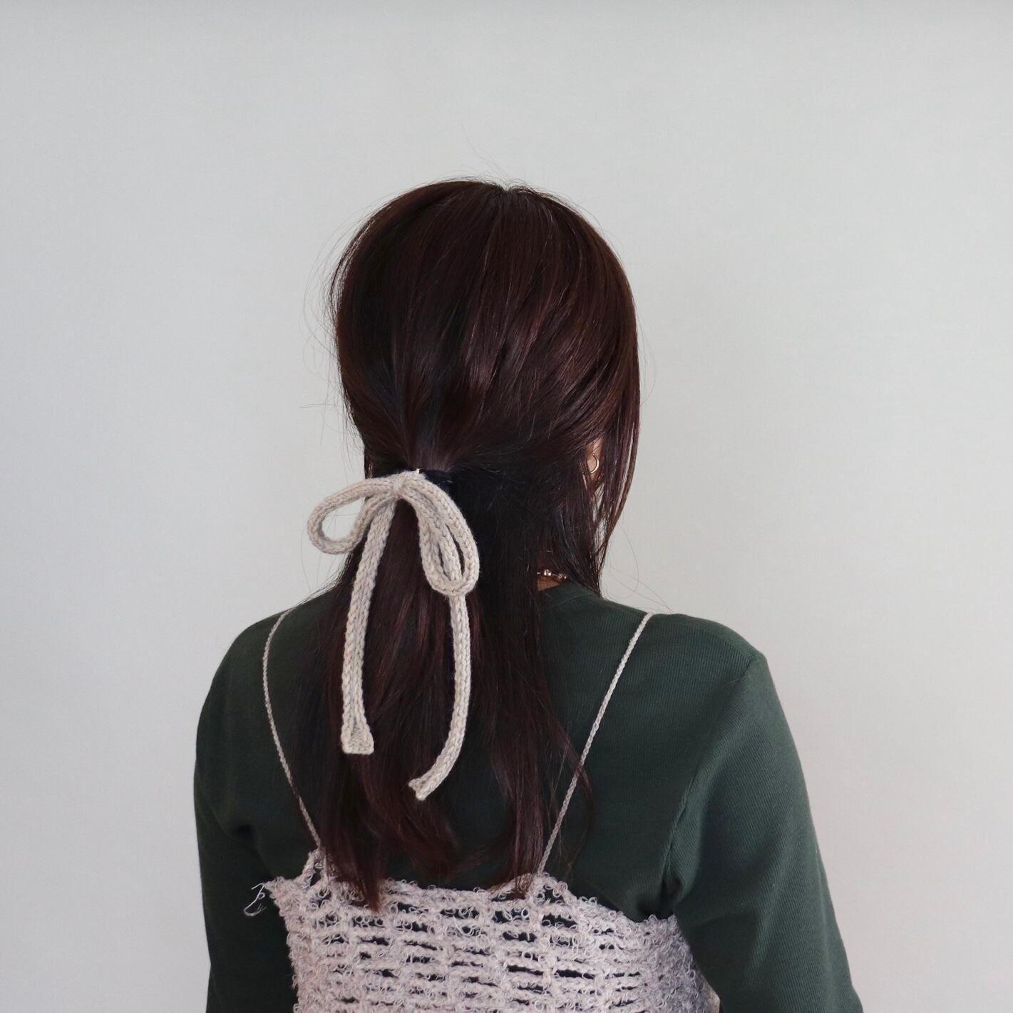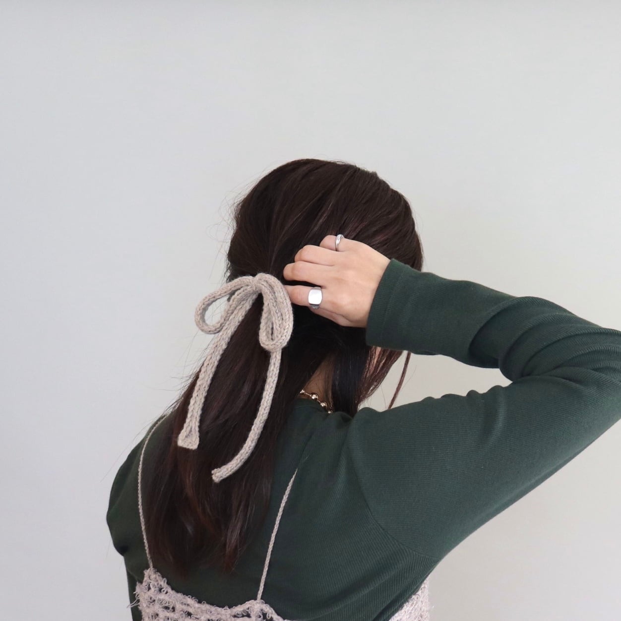 大人っぽく見えるように、細長い作りにして、ゆるっと脱力感のあるリボンに仕上げました。色も甘くなり過ぎないように、くすみカラーを採用。コーディネートのポイントにおすすめです。イヤーカフなので、ヘアゴムと違ってゴムが切れる心配もなく長く楽しめます。