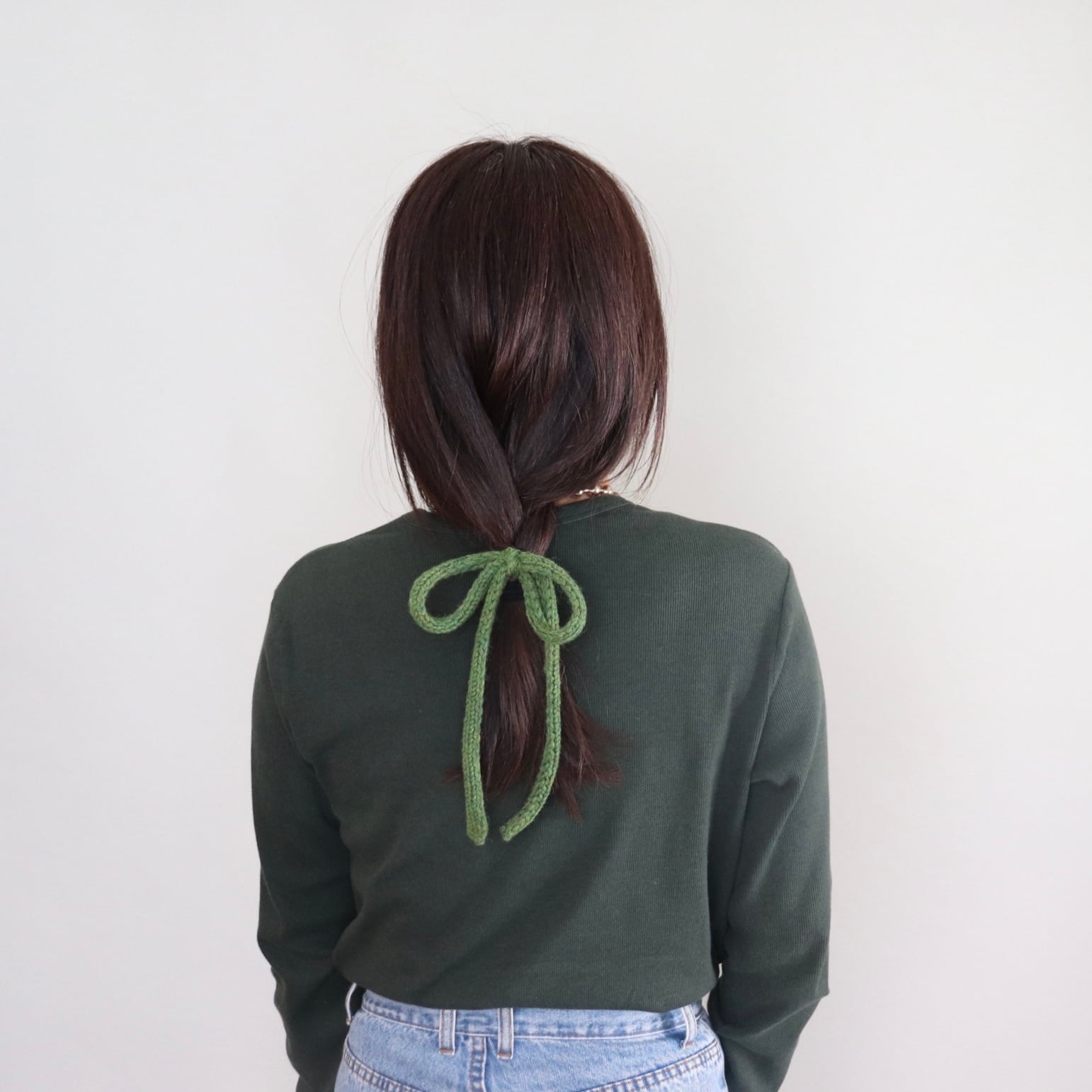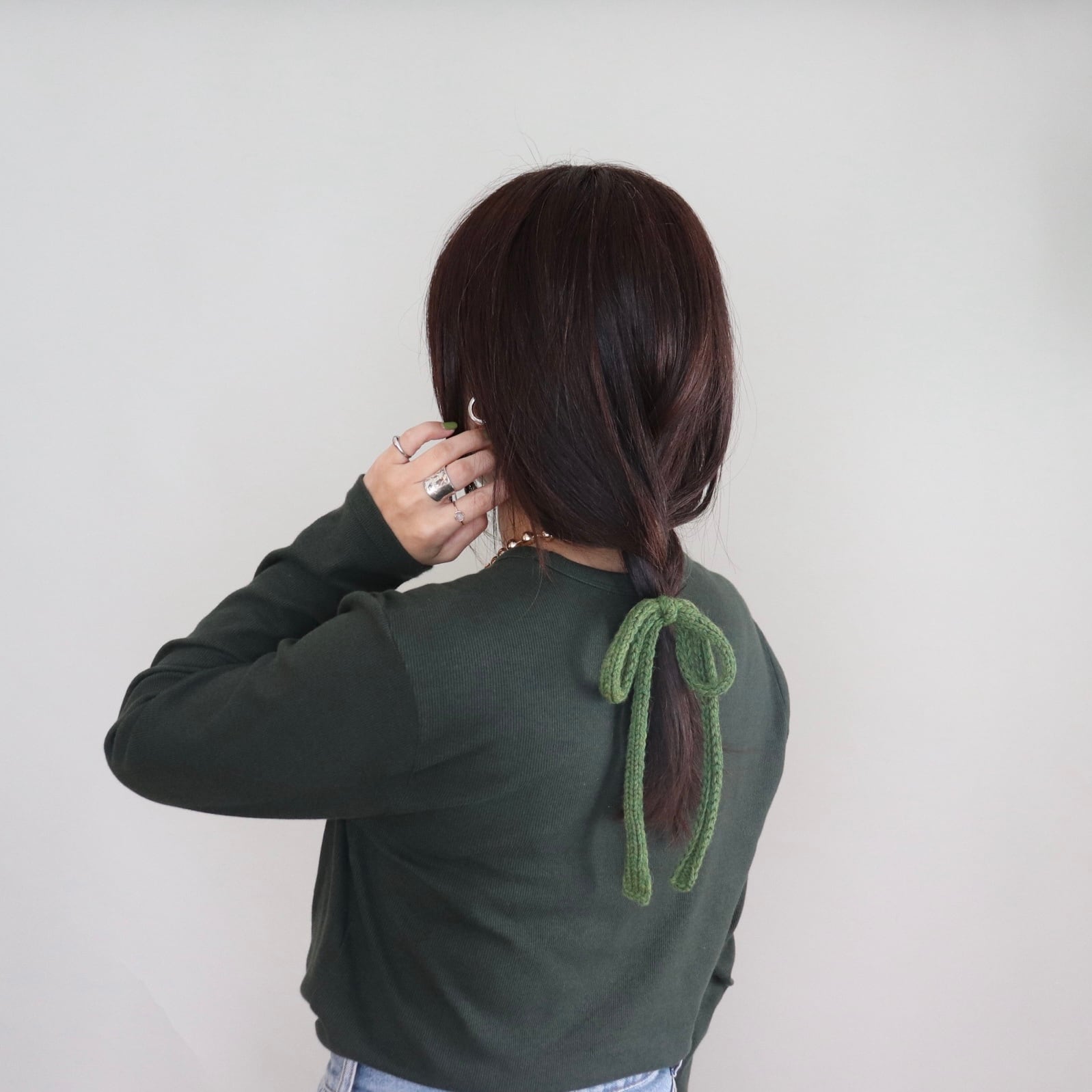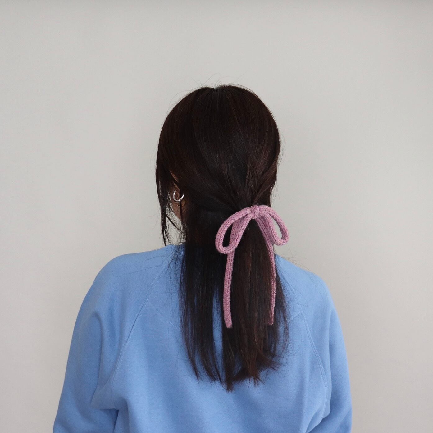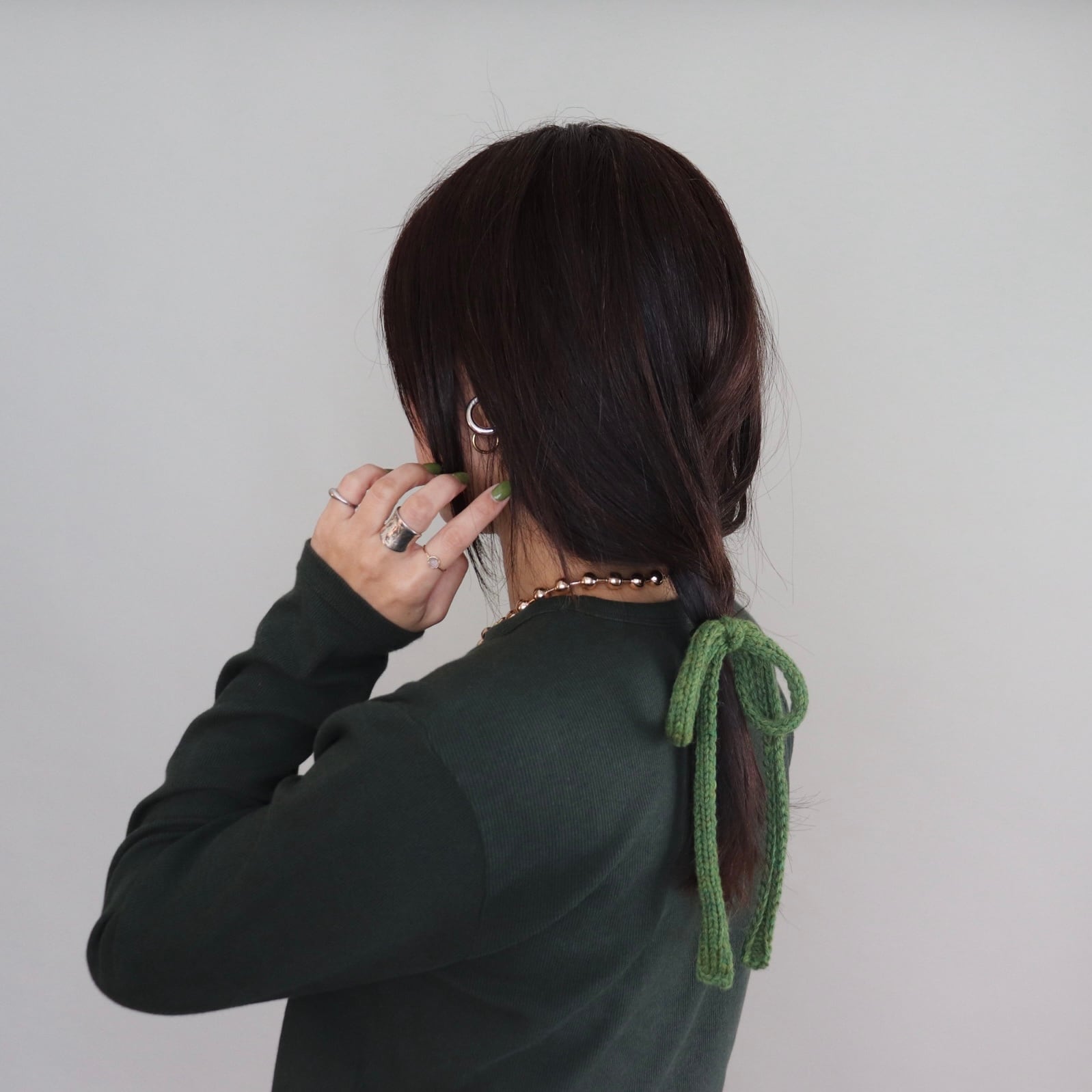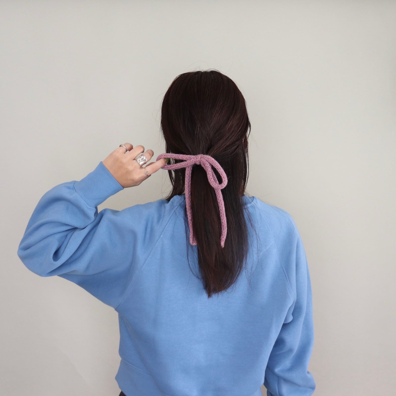 大人っぽく見えるように、細長い作りにして、ゆるっと脱力感のあるリボンに仕上げました。色も甘くなり過ぎないように、くすみカラーを採用。コーディネートのポイントにおすすめです。イヤーカフなので、ヘアゴムと違ってゴムが切れる心配もなく長く楽しめます。